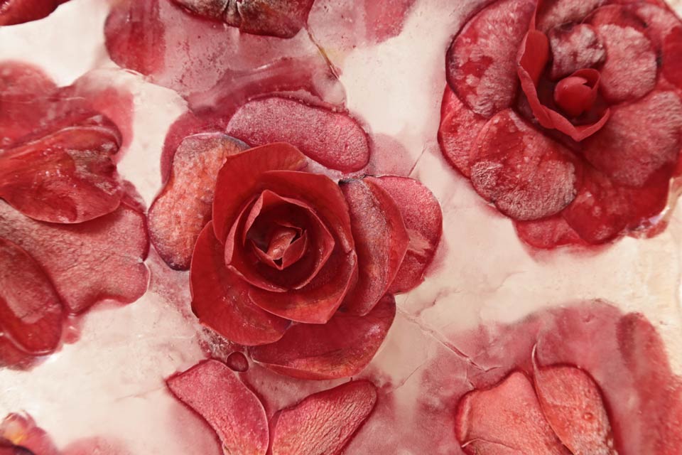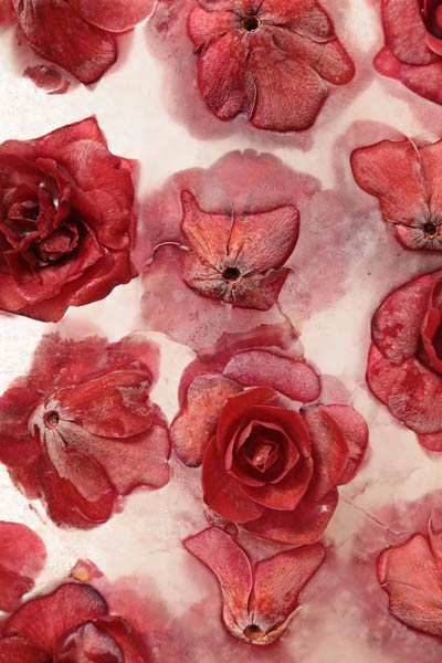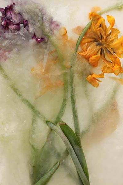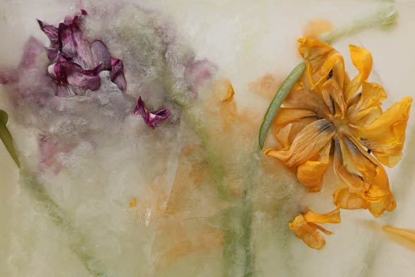 I designed and built a slotted rack to firmly hold the frozen contents of a 9" x 12" baking pan upright as it melts. I then set this up on a pedestal on top of a white garbage bag (to reflect light upwards) in front of a white wall, then crop in-camera to compose the images I want – typically a vertical (full) and horizontal shot of each frozen composition.